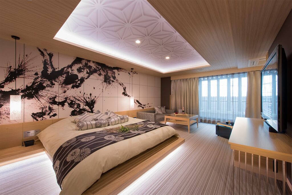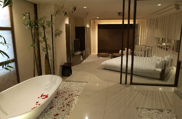 703号室/Fタイプの客室は広々とした空間で、アジアンリゾート風の造り。展望風呂もあり岩盤浴まで完備しています。70インチ液晶テレビも付いていて快適に過ごせると思います。