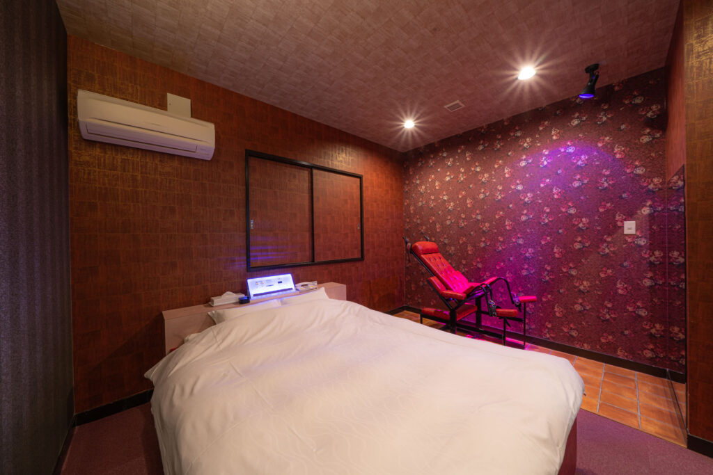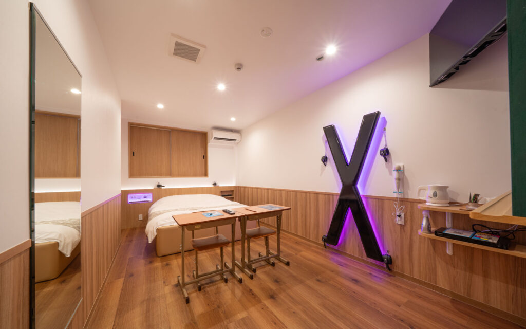 特注制作のX拘束具が設置され、正面には姿鏡。視線が合った瞬間に「これは普通じゃないね」と気分が一段階上がります。さらに、コンセプトルームならではの演出として、本物の教室家具を採用。黒板も実際に使えるので、懐かしさに浸るもよし、ちょっとした黒板アートで遊ぶもよし。非日常と遊び心が同居する空間です。